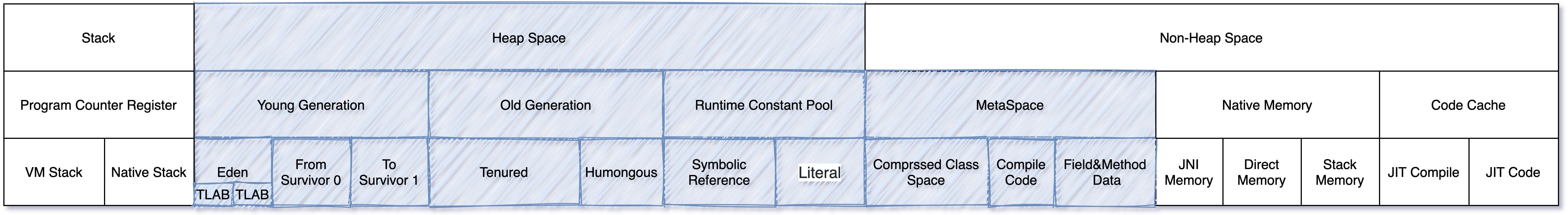 目前使用最多的是 CMS 和 G1 收集器,二者都有分代的概念,主要内存结构如下:
