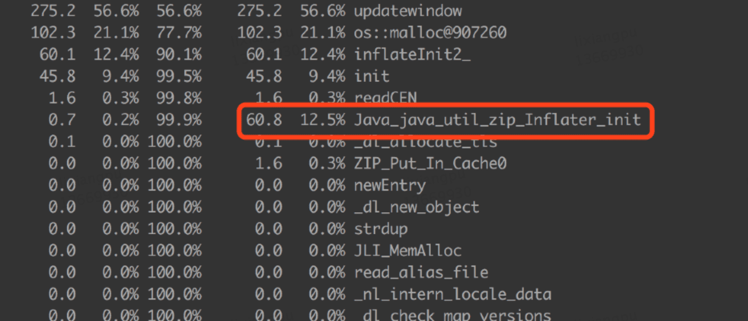 gperftools 是 Google 开发的一款非常实用的工具集,它的原理是在 Java 应用程序运行时,当调用 malloc 时换用它的 libtcmalloc.so,这样就能对内存分配情况做一些统计。我们使用 gperftools 来追踪分配内存的命令。如下图所示,通过 gperftools 发现 Java_java_util_zip_Inflater_init 比较可疑。