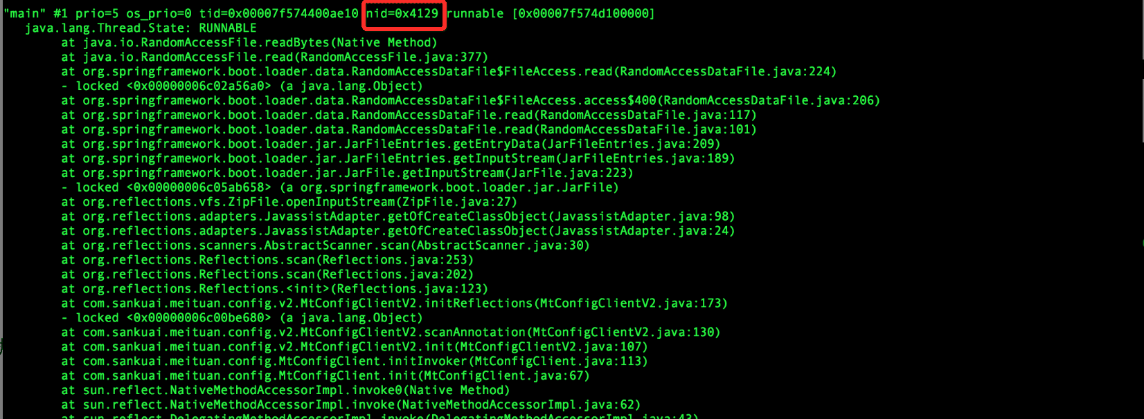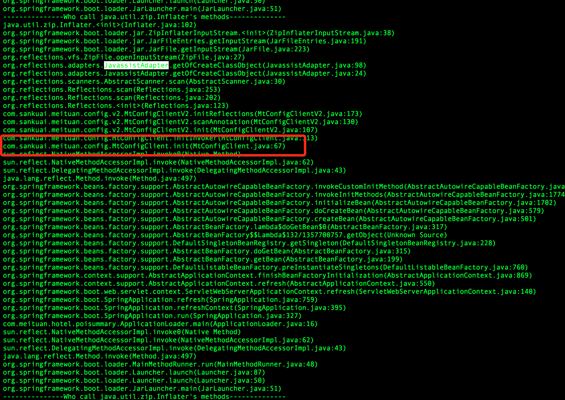 这里基本上就可以看出问题来了:MCC(美团统一配置中心)使用了Reflections进行扫包,底层使用了Spring Boot去加载JAR。因为解压JAR使用Inflater类,需要用到堆外内存,然后使用Btrace去追踪这个类,栈如下: