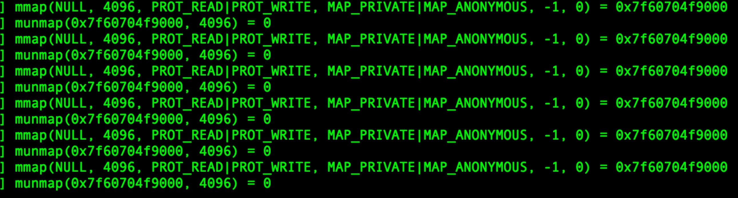 因为使用gperftools没有追踪到这些内存,于是直接使用命令"strace -f -e"brk,mmap,munmap" -p pid"追踪向OS申请内存请求,但是并没有发现有可疑内存申请。strace监控如下图所示: