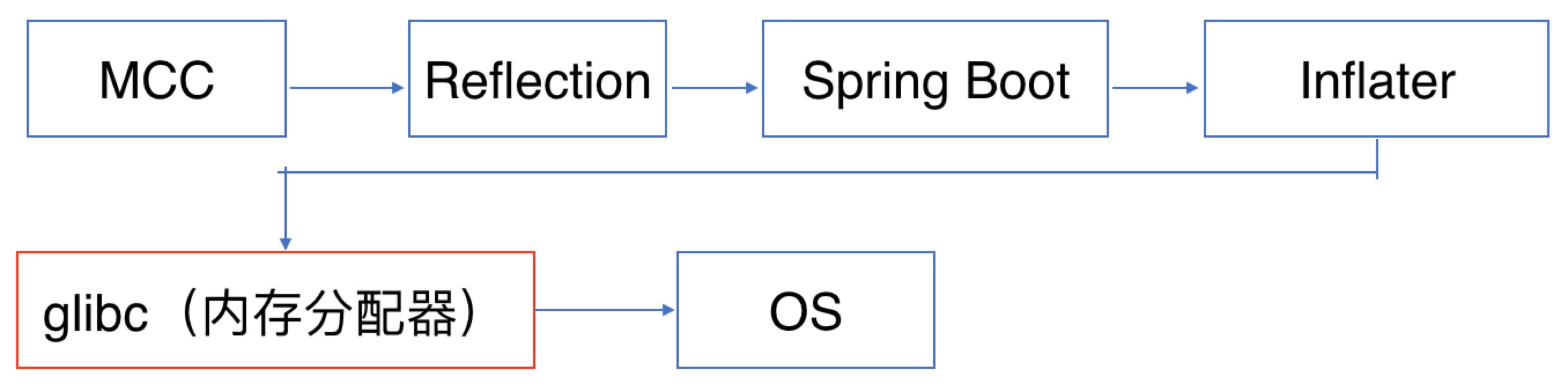 整个内存分配的流程如上图所示。MCC扫包的默认配置是扫描所有的JAR包。在扫描包的时候,Spring Boot不会主动去释放堆外内存,导致在扫描阶段,堆外内存占用量一直持续飙升。当发生GC的时候,Spring Boot依赖于finalize机制去释放了堆外内存;但是glibc为了性能考虑,并没有真正把内存归返到操作系统,而是留下来放入内存池了,导致应用层以为发生了"内存泄漏"。所以修改MCC的配置路径为特定的JAR包,问题解决。笔者在发表这篇文章时,发现Spring Boot的最新版本(2.0.5.RELEASE)已经做了修改,在ZipInflaterInputStream主动释放了堆外内存不再依赖GC;所以Spring Boot升级到最新版本,这个问题也可以得到解决。