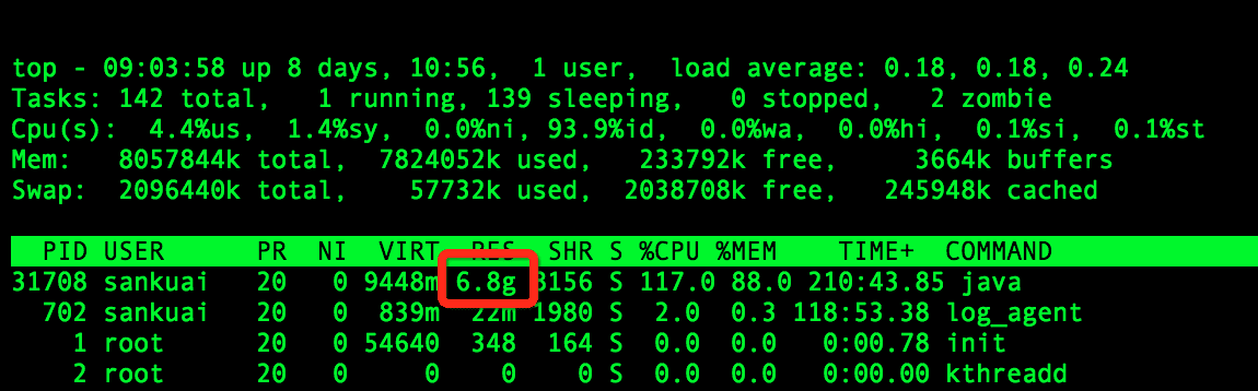 为了更好地实现对项目的管理,我们将组内一个项目迁移到MDP框架(基于Spring Boot),随后我们就发现系统会频繁报出Swap区域使用量过高的异常。笔者被叫去帮忙查看原因,发现配置了4G堆内内存,但是实际使用的物理内存竟然高达7G,确实不正常。JVM参数配置是"-XX:MetaspaceSize=256M -XX:MaxMetaspaceSize=256M -XX:+AlwaysPreTouch -XX:ReservedCodeCacheSize=128m -XX:InitialCodeCacheSize=128m, -Xss512k -Xmx4g -Xms4g,-XX:+UseG1GC -XX:G1HeapRegionSize=4M",实际使用的物理内存如下图所示: