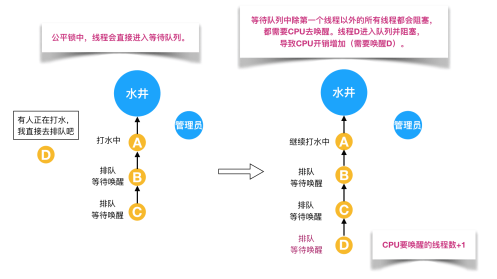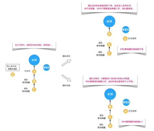 但是对于非公平锁,管理员对打水的人没有要求。即使等待队伍里有排队等待的人,但如果在上一个人刚打完水把锁还给管理员而且管理员还没有允许等待队伍里下一个人去打水时,刚好来了一个插队的人,这个插队的人是可以直接从管理员那里拿到锁去打水,不需要排队,原本排队等待的人只能继续等待。如下图所示: