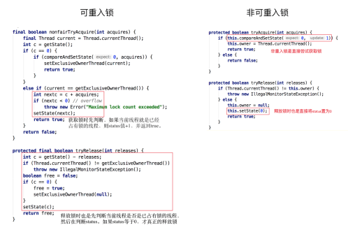 当线程尝试获取锁时,可重入锁先尝试获取并更新status值,如果status == 0表示没有其他线程在执行同步代码,则把status置为1,当前线程开始执行。如果status != 0,则判断当前线程是否是获取到这个锁的线程,如果是的话执行status+1,且当前线程可以再次获取锁。而非可重入锁是直接去获取并尝试更新当前status的值,如果status != 0的话会导致其获取锁失败,当前线程阻塞。