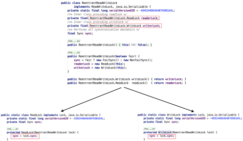 我们看到ReentrantReadWriteLock有两把锁:ReadLock和WriteLock,由词知意,一个读锁一个写锁,合称"读写锁"。再进一步观察可以发现ReadLock和WriteLock是靠内部类Sync实现的锁。Sync是AQS的一个子类,这种结构在CountDownLatch、ReentrantLock、Semaphore里面也都存在。