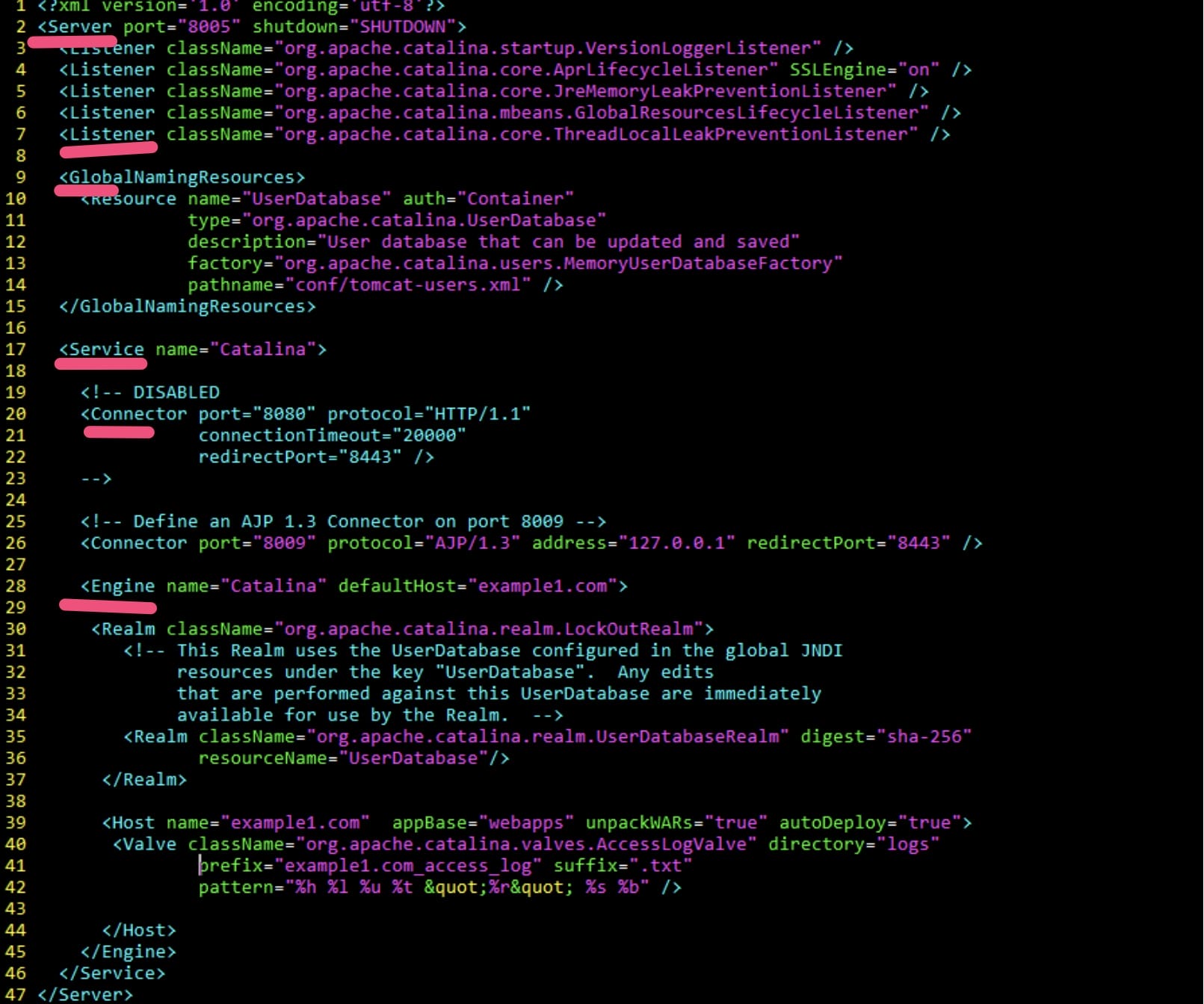 Server: 表示服务器,它提供了一种优雅的方式来启动和停止整个系统,不必单独启停连接器和容器;它是Tomcat构成的顶级构成元素,所有一切均包含在Server中;