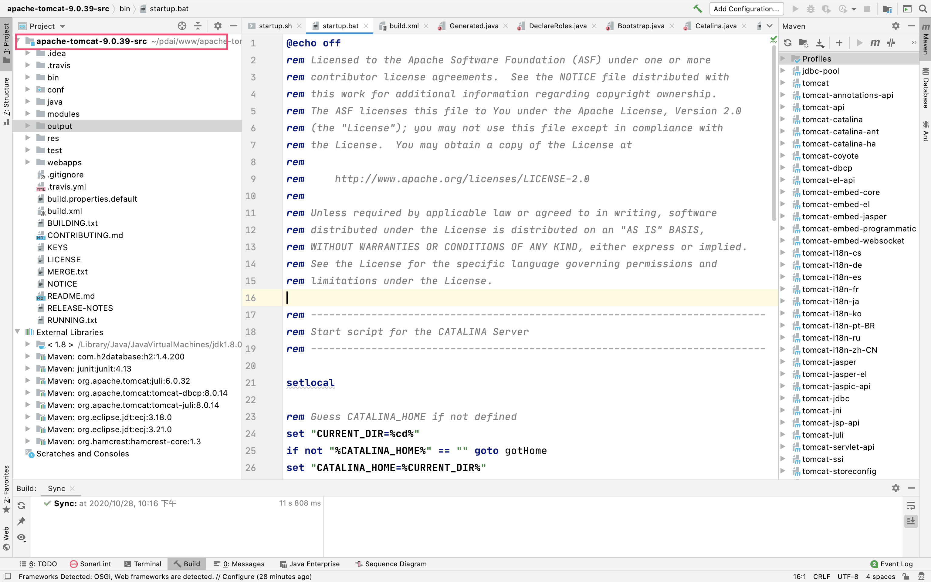 当我们初学tomcat的时候, 肯定先要学习怎样启动tomcat. 在tomcat的bin目录下有两个启动tomcat的文件, 一个是startup.bat, 它用于windows环境下启动tomcat; 另一个是startup.sh, 它用于linux环境下tomcat的启动. 两个文件中的逻辑是一样的, 我们只分析其中的startup.bat.