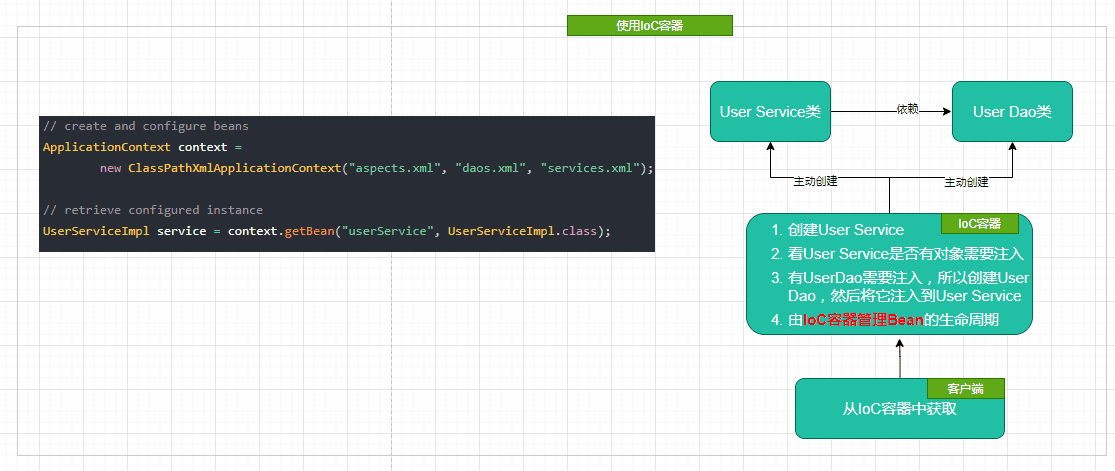 - 在Spring基础 - Spring简单例子引入Spring的核心中向你展示了IoC的基础含义,同时以此发散了一些IoC相关知识点; 本节将在此基础上进一步解读IOC的含义以及IOC的使用方式