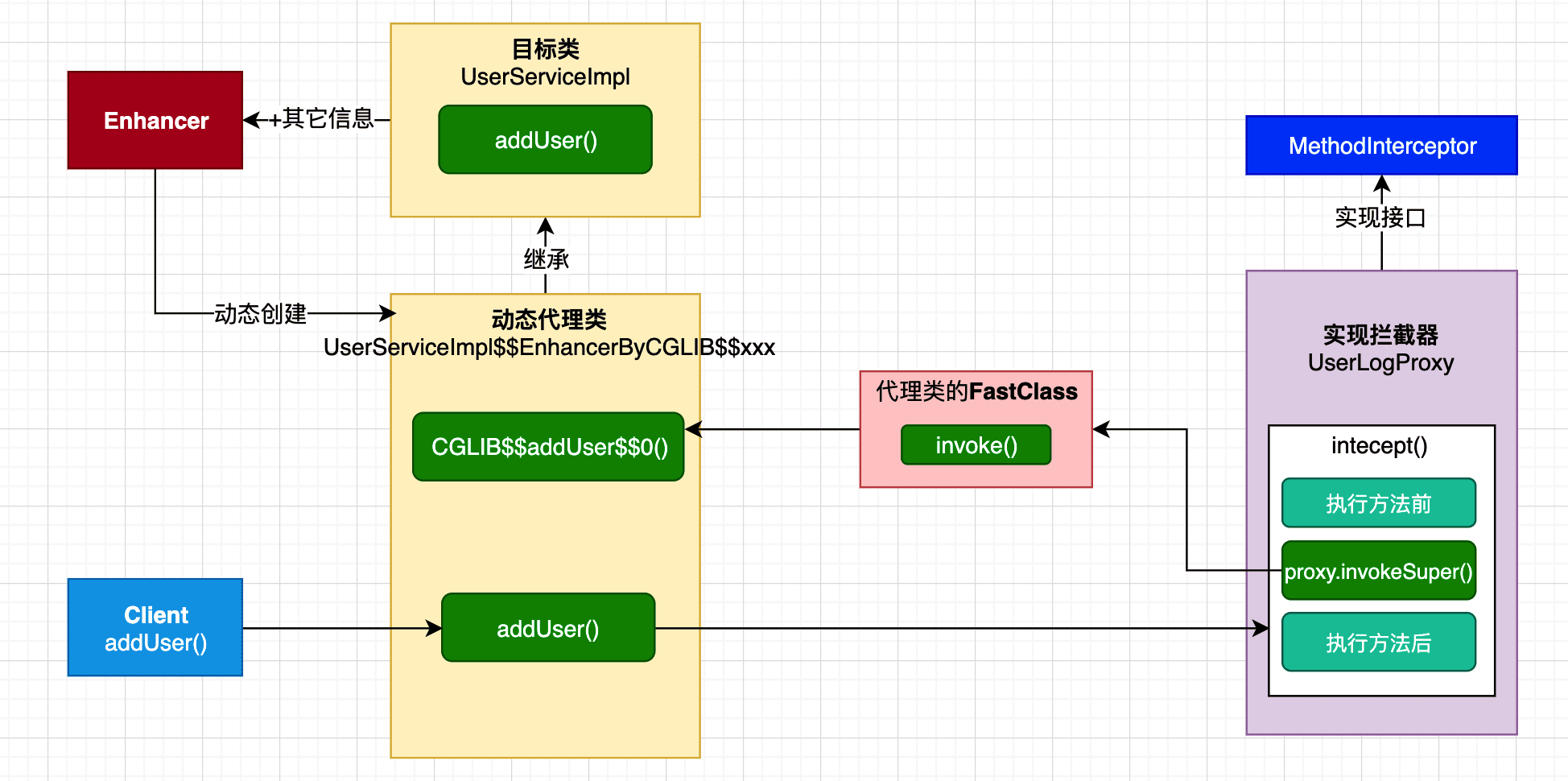 - 上文我们介绍了Spring AOP原理解析的切面实现过程(将切面类的所有切面方法根据使用的注解生成对应Advice,并将Advice连同切入点匹配器和切面类等信息一并封装到Advisor)。本文在此基础上继续介绍,代理(cglib代理和JDK代理)的实现过程。