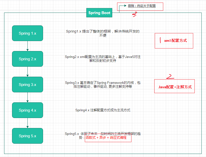 通过上述的框架介绍和例子,已经初步知道了Spring设计的两个大的要点:IOC和AOP;从框架的设计角度而言,更为重要的是简化开发,比如提供更为便捷的配置Bean的方式,直至0配置(即约定大于配置)。这里我将通过Spring历史版本的发展,和SpringBoot的推出等,来帮你理解Spring框架是如何逐步简化开发的。