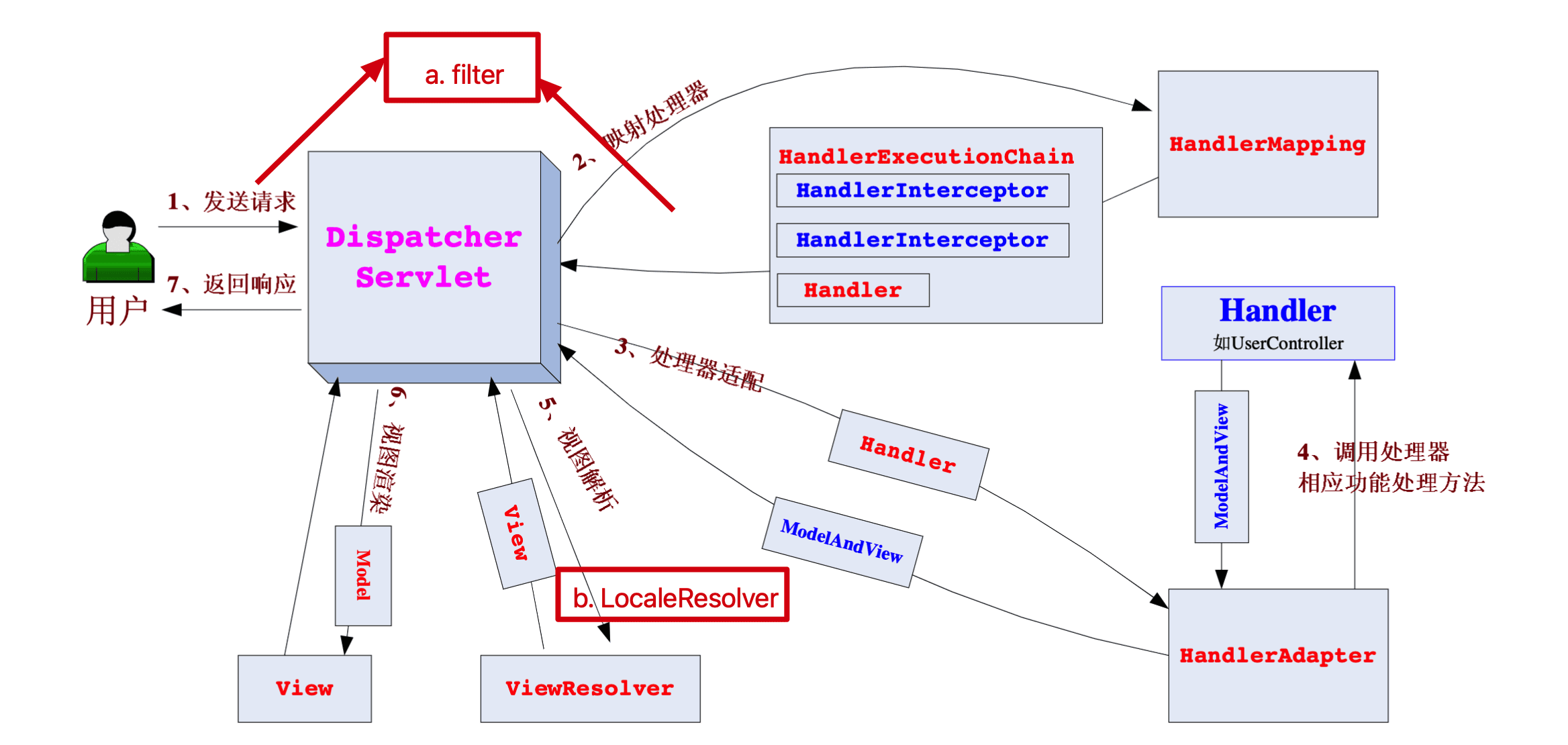 - DispatcherServlet------>HandlerAdapter,HandlerAdapter 将会把处理器包装为适配器,从而支持多种类型的处理器, 即适配器设计模式的应用,从而很容易支持很多类型的处理器;