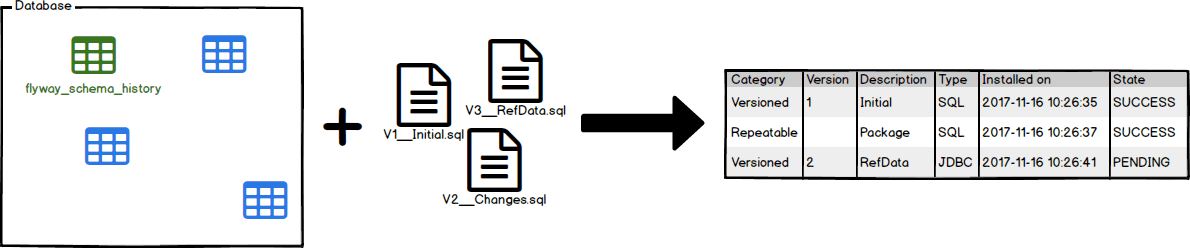 - 版本变迁(Versioned Migrations): 每个版本执行一次,包含有版本、描述和校验和;常用于创建,修改,删除表;插入,修改数据等