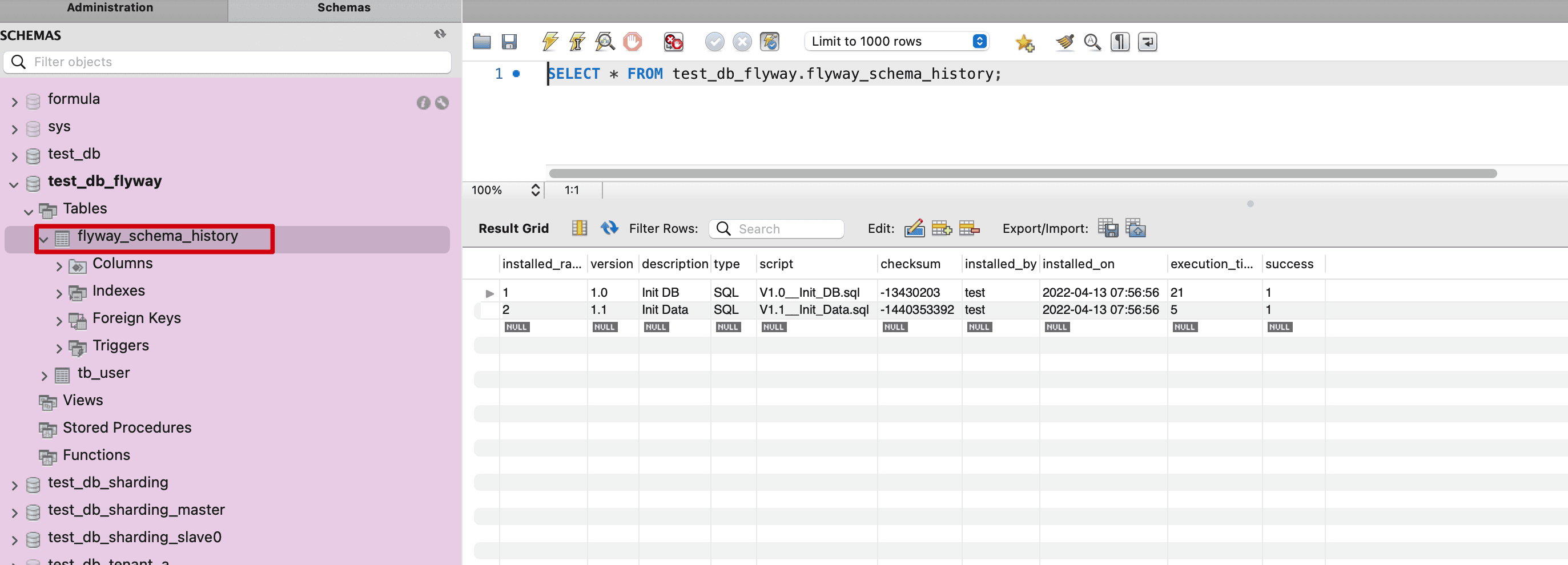 2022-04-13 07:56:56.346 INFO 86030 --- [ main] o.f.core.internal.command.DbMigrate : Successfully applied 2 migrations to schema `test_db_flyway`, now at version v1.1 (execution time 00:00.058s)