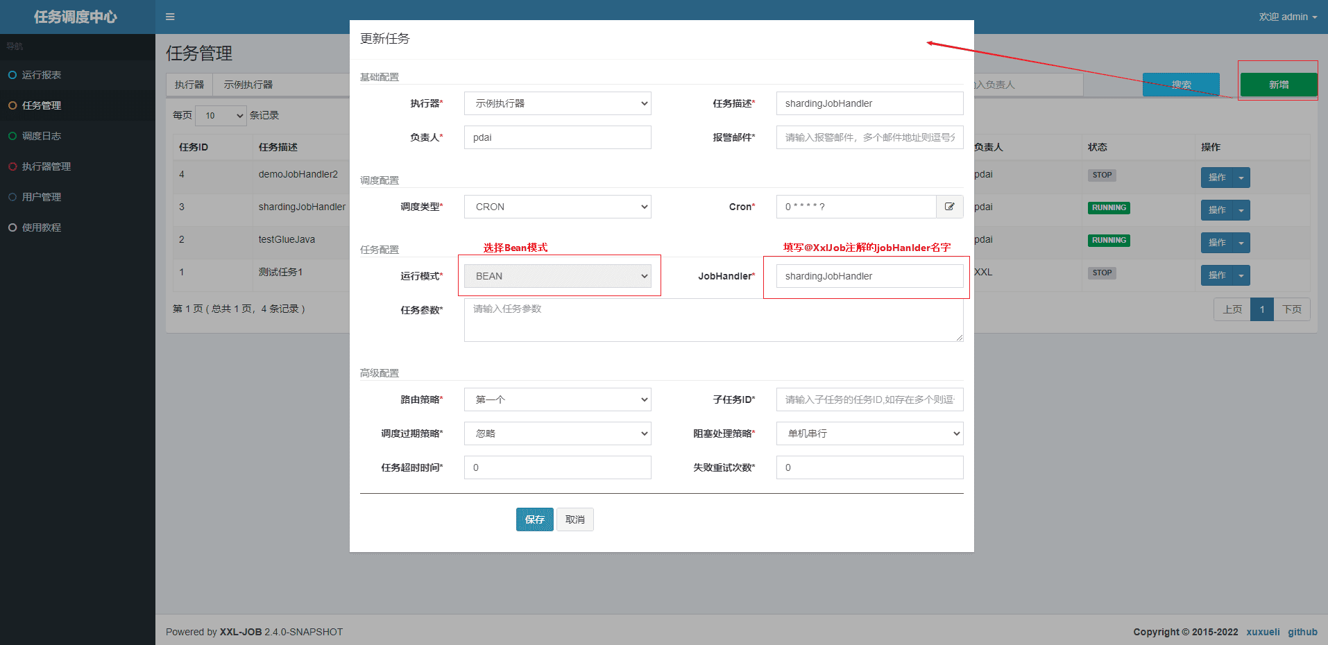新增Job, 并把上述的@XxlJob(value="自定义jobhandler名称", init = "JobHandler初始化方法", destroy = "JobHandler销毁方法")中 自定义jobhandler名称 填写到JobHandler中。