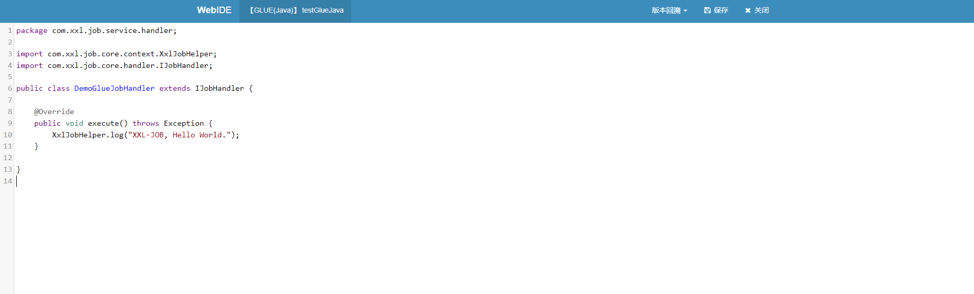 任务以源码方式维护在调度中心,支持通过Web IDE在线更新,实时编译和生效,因此不需要指定JobHandler。