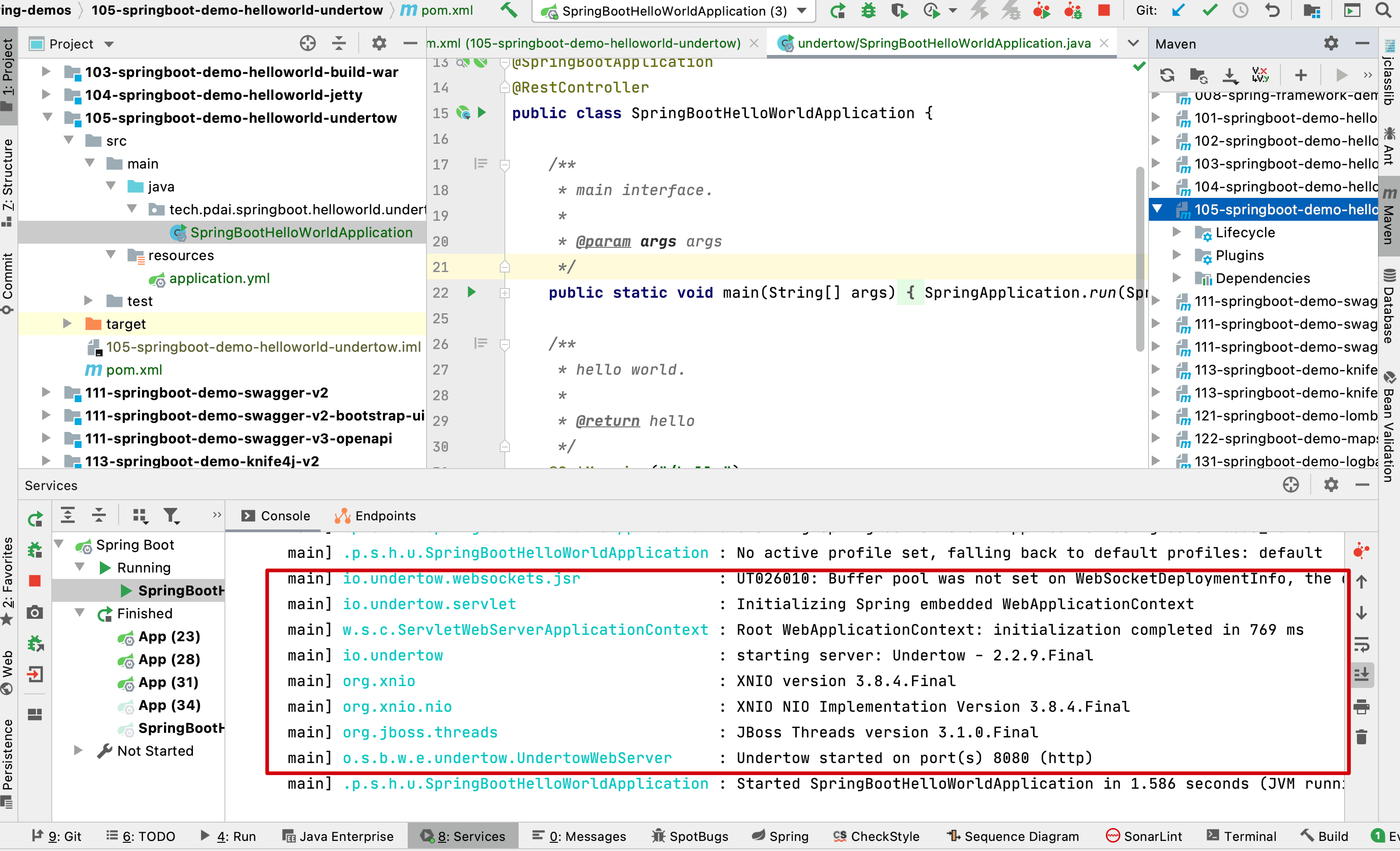 这里以一个Helloworld项目(SpringBoot入门 - 创建第一个Hello world工程)为例,在此基础上移除内嵌的Tomcat并使用Undertow。