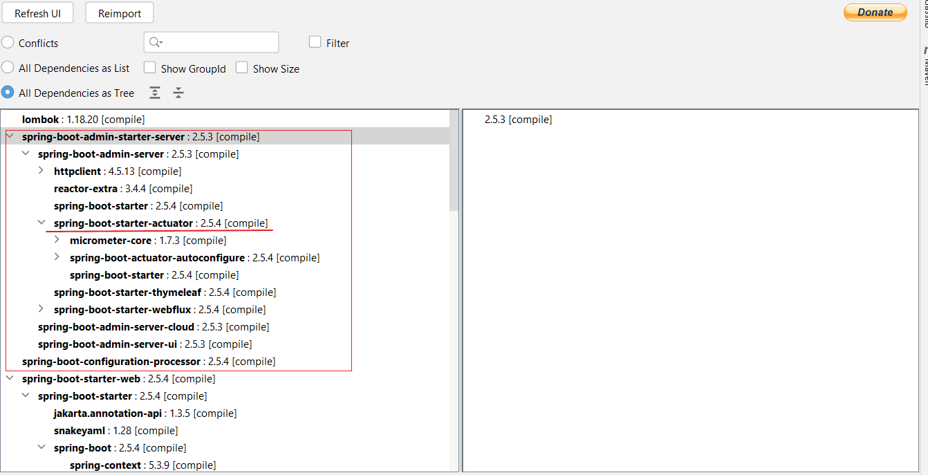 从如下POM的依赖关系可以看出Spring Boot Admin本质上集成了actuator,将实时警报,此外添加一些实时警报功能等。