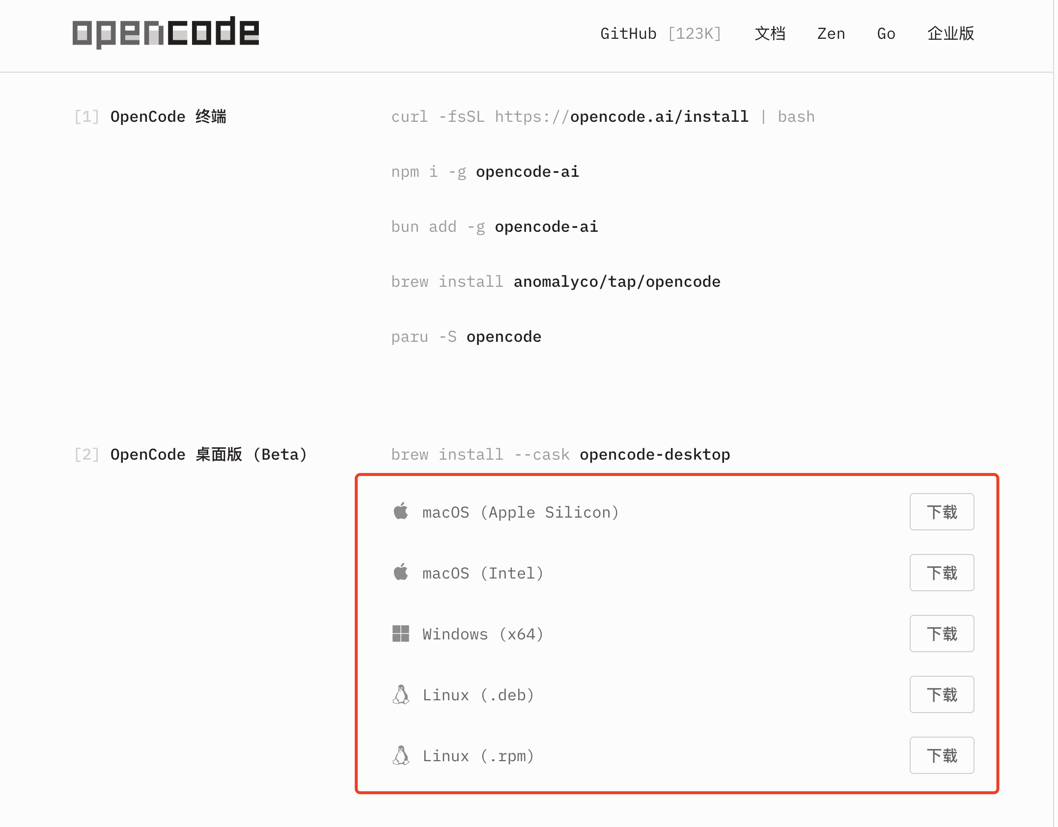 OpenCode 也提供桌面端应用,可直接从官网下载。