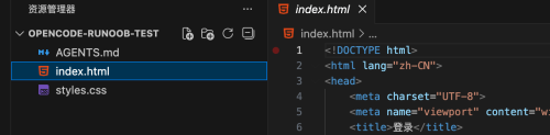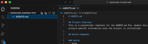 opencode-runoob-test 目录下可以看到 AGENTS.md 文件: