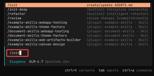 这会生成一个 .opencode/ 文件夹,用于存储项目的向量化索引和自定义指令。
