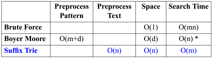 - 构建后缀树需要 O(dn) 的时间,d 为字符集的长度(alphabet);