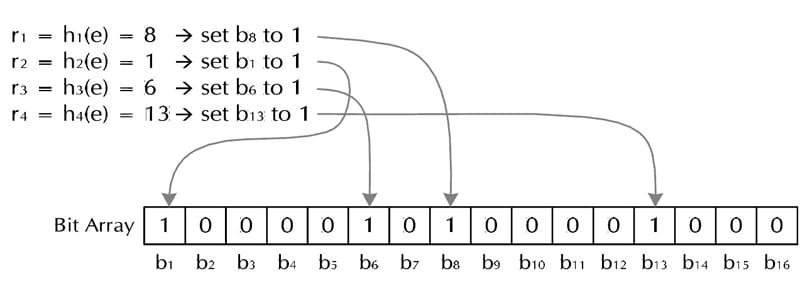 初始状态下,Bloom Filter是一个m位的位数组,且数组被0所填充。同时,我们需要定义k个不同的hash函数,每一个hash函数都随机的将每一个输入元素映射到位数组中的一个位上。那么对于一个确定的输入,我们会得到k个索引。