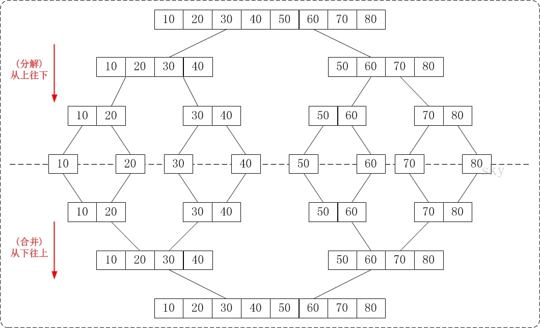 从上往下的归并排序采用了递归的方式实现。它的原理非常简单,如下图: