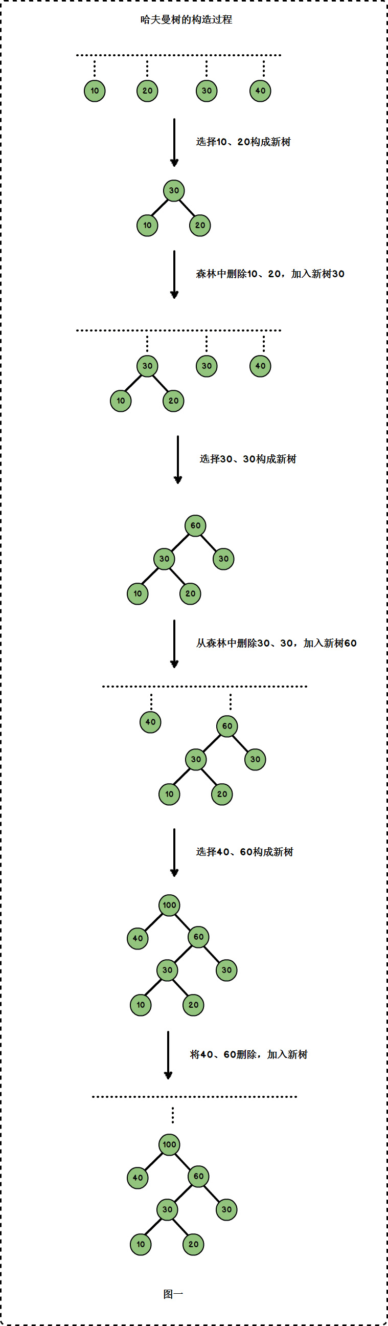 上图中,它的叶子节点为{10,20,30,40},以这4个权值构建哈夫曼树的过程为: