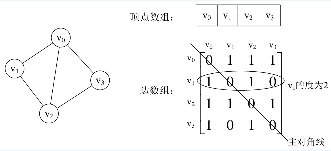 我们可以设置两个数组,顶点数组为vertex[4]={v0,v1,v2,v3},边数组arc[4][4]为上图右边这样的一个矩阵。对于矩阵的主对角线的值,即arc[0][0]、arc[1][1]、arc[2][2]、arc[3][3],全为0是因为不存在顶点的边。