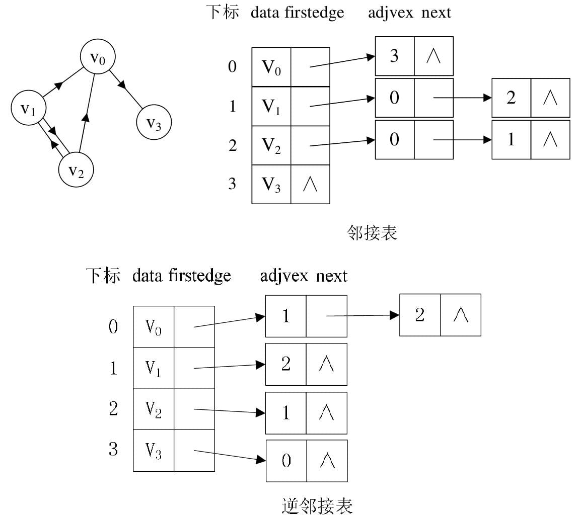 若是有向图,邻接表结构是类似的,但要注意的是有向图由于有方向的。因此,有向图的邻接表分为出边表和入边表(又称逆邻接表),出边表的表节点存放的是从表头节点出发的有向边所指的尾节点;入边表的表节点存放的则是指向表头节点的某个顶点,如下图所示。