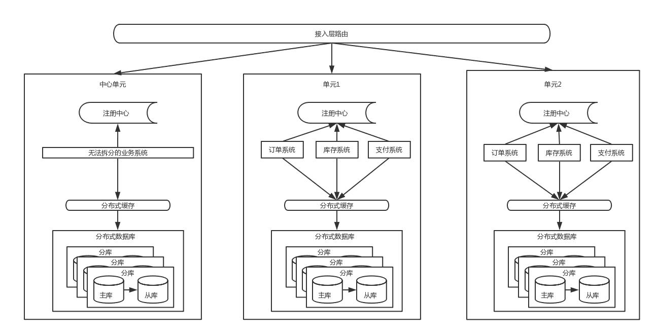 从上面的架构图里能看到,流量从接入层按照路由规则(比如以用户ID来路由)路由到不同单元,每个单元内都是高内聚,包含了核心系统,数据层面的分片逻辑是与接入层路由逻辑一致,也解决了数据库连接的瓶颈问题,但是一些跨单元的调用是无法避免的,同时也有些无法拆分的业务需要放在中心单元,供所有其他单元调用。