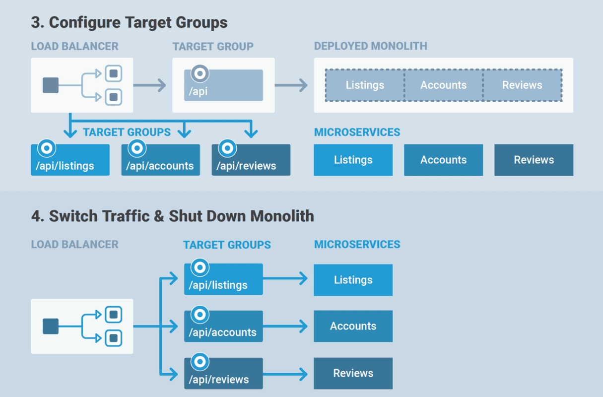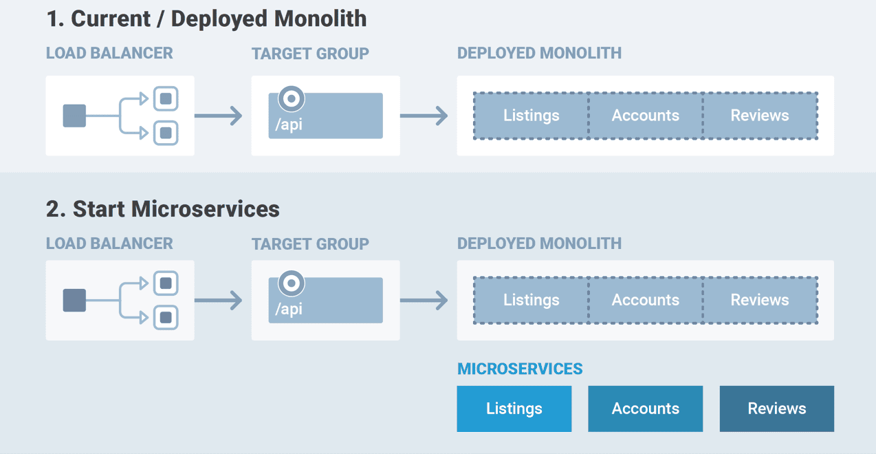 微服务与微前端原理和软件工程,面向对象设计中的原理同样相通,都是遵循单一职责(Single Responsibility)、关注分离(Separation of Concerns)、模块化(Modularity)与分而治之(Divide & Conquer)等基本的原则。从巨石型应用到微服务的衍化也并非一蹴而就,如下图也演示了简单的渐进式替代过程:
