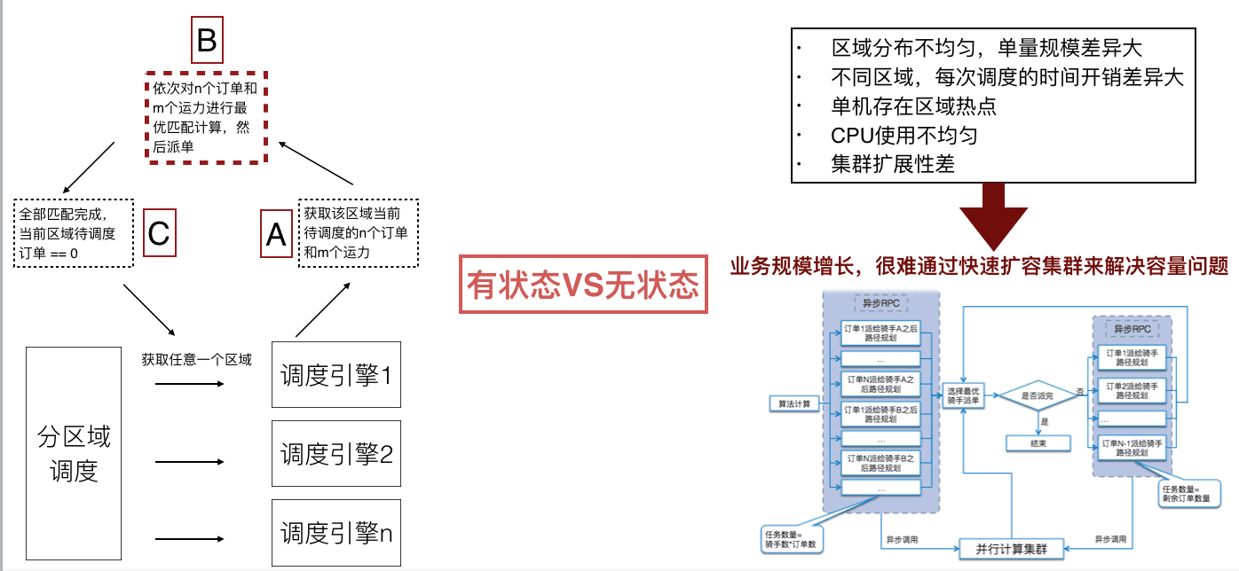首先,配送后台技术团队通过架构升级,将有状态节点变成无状态节点,通过并行计算的能力,让小的业务节点去分担计算压力,以此实现快速扩容。