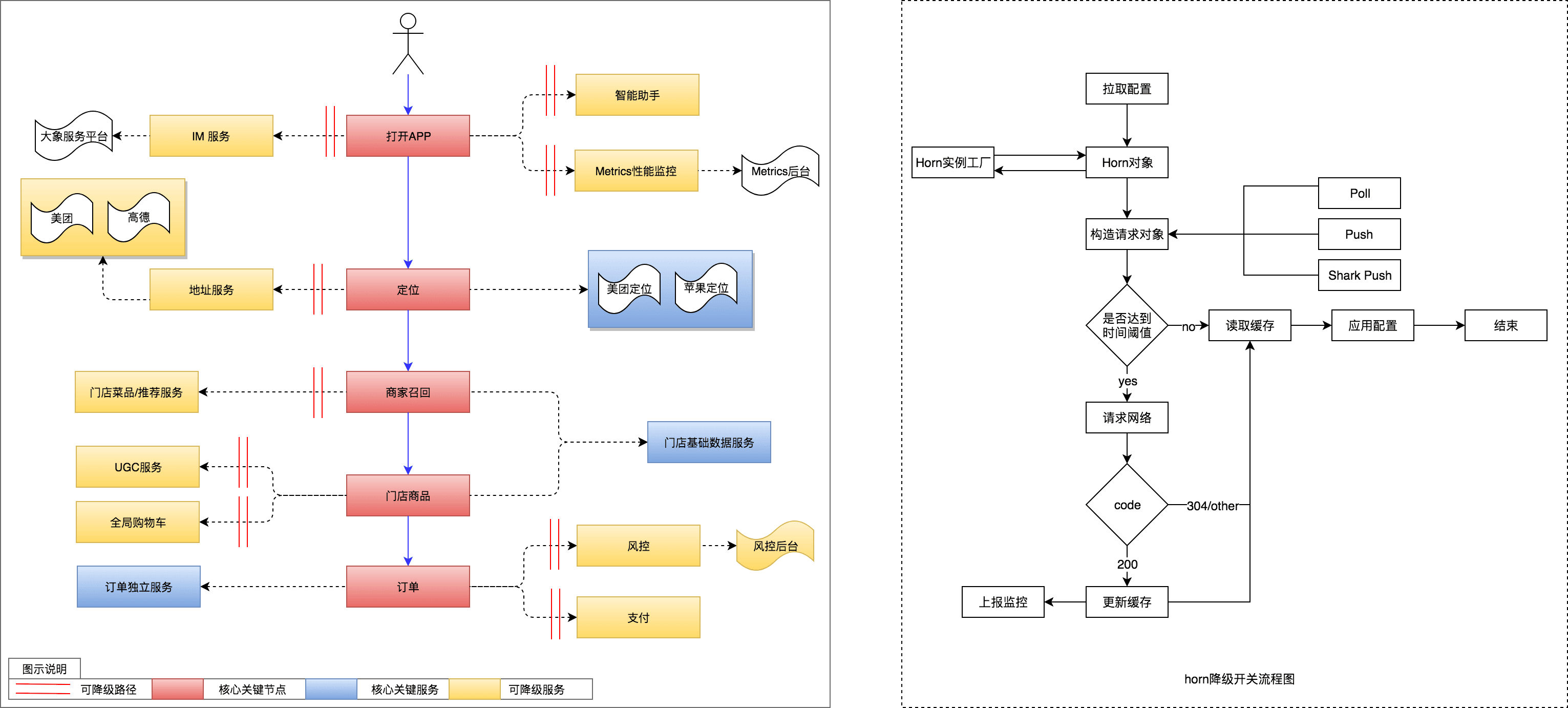 右边则是美团外卖客户端业务/技术降级开关流程图。通过推拉结合,缓存更新策略,我们能够分钟级别同步降级配置,快速止损。