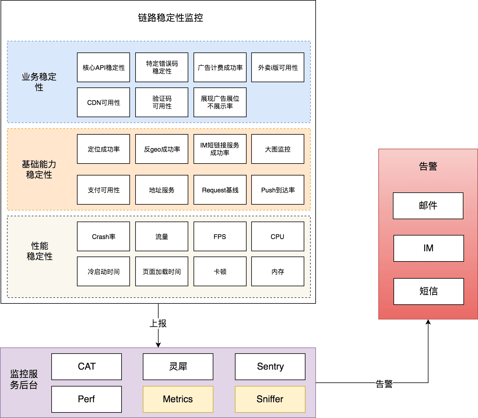 这是美团外卖客户端整体质量体系全景图。整体思路:监控报警,日志体系,容灾。