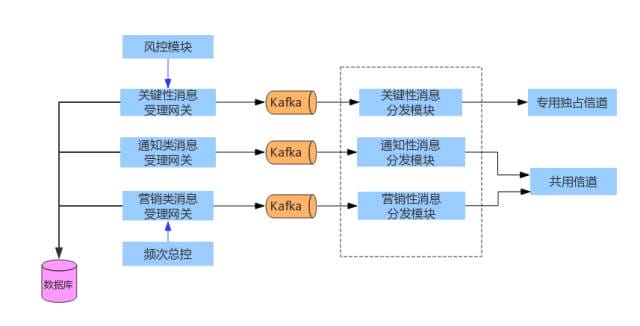在实际的业务场景中,发送给会员,供应商和内部工作人员的消息,分为三种类型:关键性消息,通知类消息,以及营销类消息。关键性消息的特点是,低时延,低吞吐。通知类消息的特点是中时延,高吞吐。营销类消息的特点是中时延,高吞吐。针对不同的消息类型,应该选择不同的受理和分发模块,避免互相干扰。如图3所示。