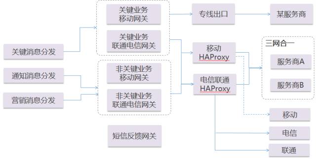 对于关键性消息,某些渠道如短信,必须设置专用的独占信道来满足业务要求。如图4所示,中国移动信道质量较其他的供应商更好,所以对于关键性消息,通过专线连接主要服务商,并同时接入电信联通haproxy做备用线路。