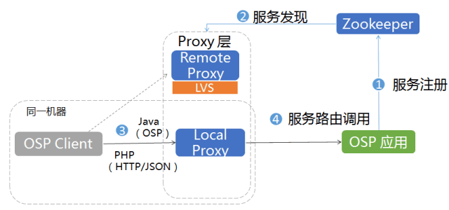 Proxy提供跨语言支持服务治理,服务发现,路由调度,限流熔断等功能,并额外支持HTTP GET +URL Path/Parameter,HTTP POST +JSON和RPC OSP协议的转换。Proxy分为LocalProxy和Remote Proxy。Local Proxy和Client部署在同一台服务器上,通过Domain Socket,减少TCP栈的调用开销。Remote Proxy作为备用链路,提供防火墙穿透,跨组织调用,非Java语言HTTP +JSON调用等功能。