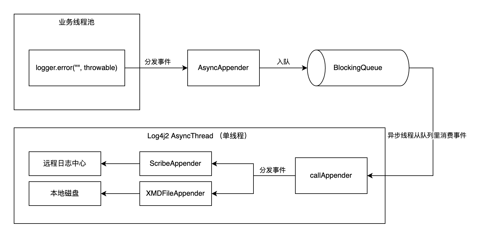 - 不建议日志配置文件中使用AsyncAppender,建议自定义Appender实现,因为AsyncAppender是日志框架默认提供的,目前最新版本中仍然存在日志事件入队前就触发加载异常堆栈类的问题,可能导致业务线程Block。