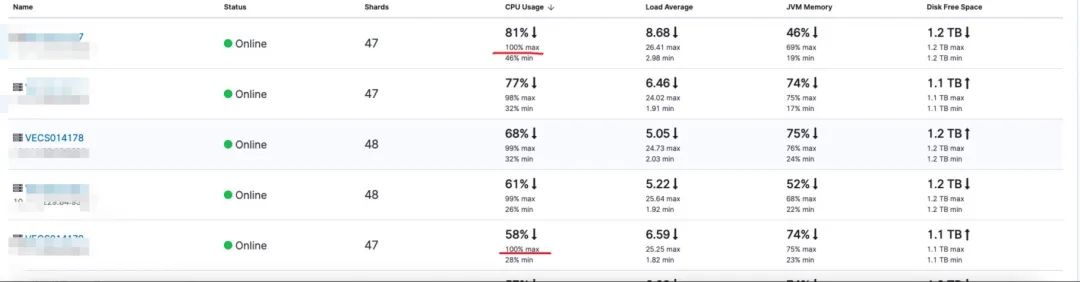 搜索平台的公共集群,由于业务众多,对业务的es查询语法缺少约束,导致问题频发。业务可能写了一个巨大的查询直接把集群打挂掉,但是我们平台人力投入有限,也不可能一条条去审核业务的es查询语法,只能通过后置的手段去保证整个集群的稳定性,通过slowlog分析等,下图中cpu已经100%了。