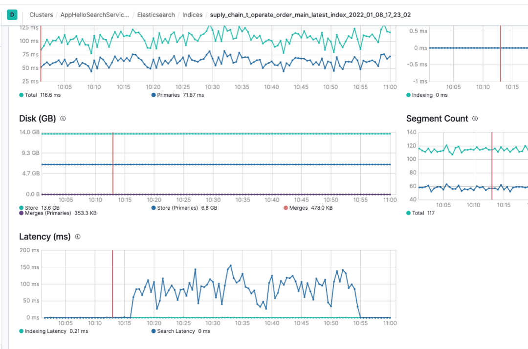 之前这个索引的平均latency在100ms+,这个是es分片处理的耗时,从搜索行为开始,到搜索行为结束的打点,不包含网络传输时间和连接建立时间,单纯的分片内的函数的处理时间的平均值,正常情况在10ms左右。