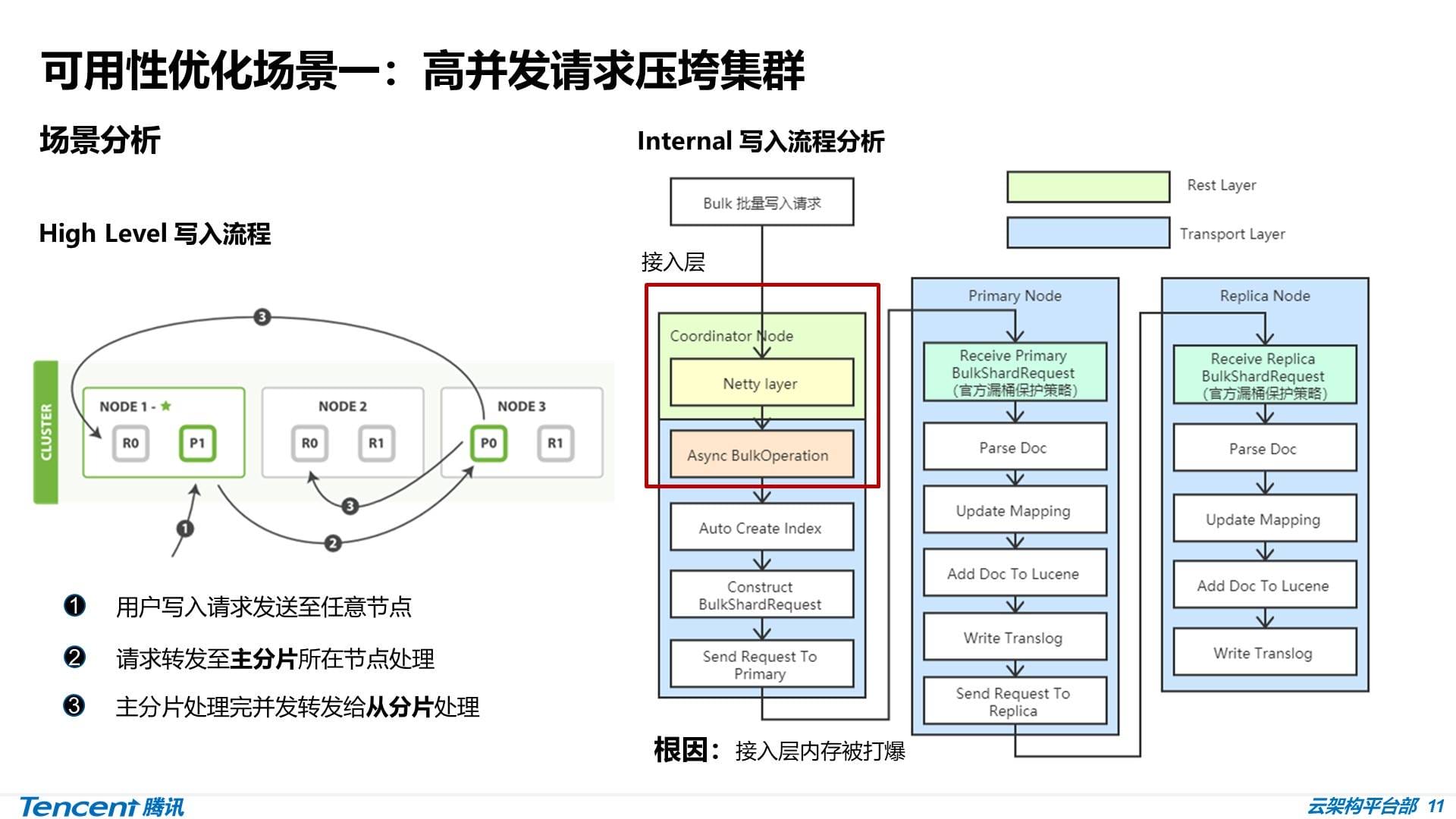 ES high level 的写入流程,用户的写入请求先到达其中一个数据节点,我们称之为数据节点。然后由该协调节点将请求转发给主分片所在节点进行写入,主分片写入完毕再由主分片转发给从分片写入,最后返回给客户端写入结果。右边是更细节的写入流程,而我们从堆栈中看到的写入请求堆积的位置就是在红色框中的接入层,节点挂掉的根因是协调节点的接入层内存被打爆。