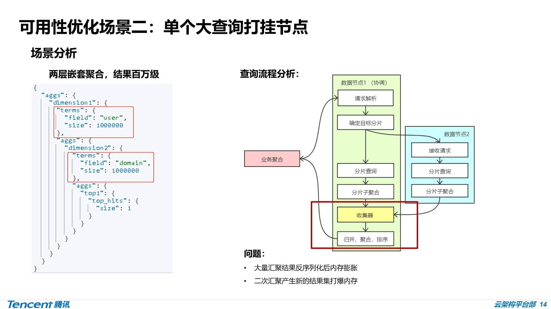 接下来介绍单个大查询打挂节点的场景。例如我们在分析场景,做多层嵌套聚合,有时候请求返回的结果集比较大,那么这个时候极有可能这一个请求就会将节点打挂。我们对聚合查询流程进行分析,请求到达协调节点之后,会拆分为分片级子查询请求给目标分片所在数据节点进行子聚合,最后协调节点收集到完整的分片结果后进行归并、聚合、排序等操作。这里的主要问题点是,协调节点大量汇聚结果反序列化后内存膨胀,以及二次聚合产生新的结果集打爆内存。