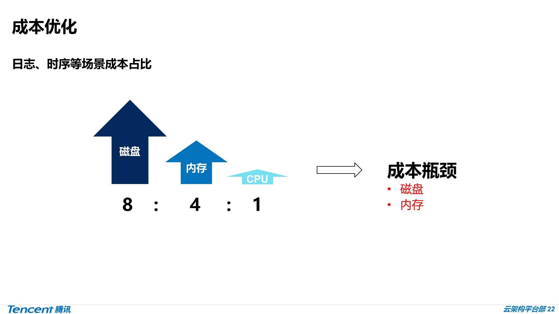 接下来我们再看成本优化。在日志、时序等大规模数据场景下,集群的 CPU、内存、磁盘的成本占比是 1 比 4 比 8。例如一般 16 核 64GB,2-5 TB 磁盘节点的成本占比大概是这个比例。因此成本的主要瓶颈在于磁盘和内存。