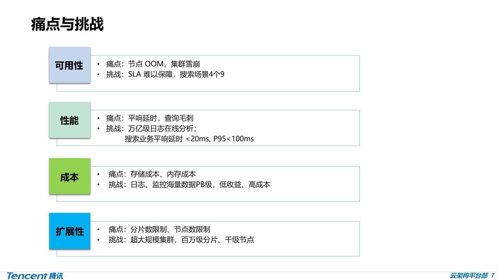 在这些丰富的应用场景,以及海量的规模背景下,我们也遇到了很多的痛点与挑战。主要覆盖在可用性、性能、成本以及扩展性方面。