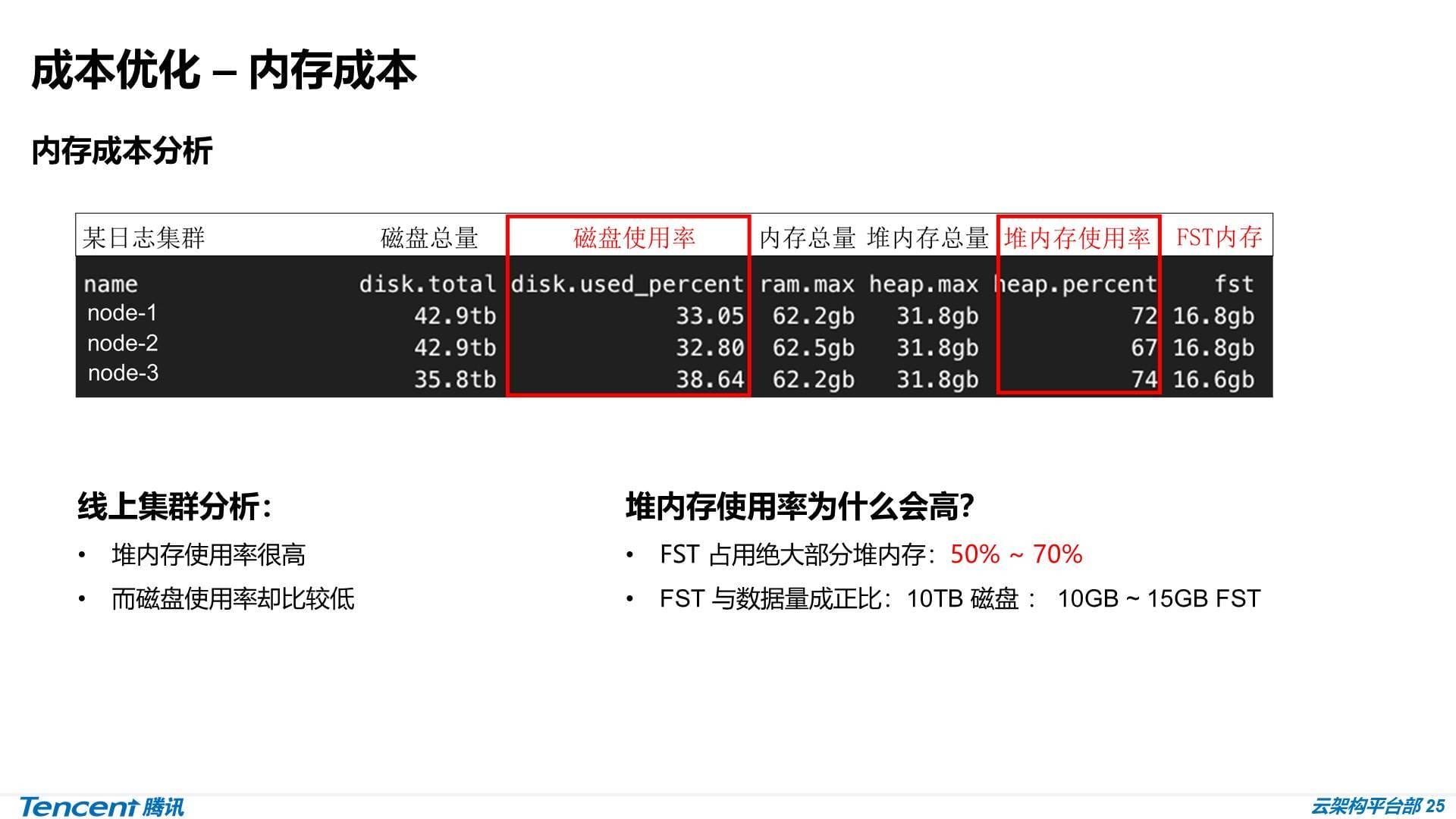 首先我们可以通过冷热分离,把冷数据放到 HDD 来降低成本,同时利用官方提供的索引生命周期管理来搬迁数据,冷数据盘一般比较大我们还要利用多盘策略来提高吞吐和数据容灾能力。最后将超冷的数据冷备到腾讯云的对象存储 COS 上,冷备成本非常低,1GB 一个月才一毛多。