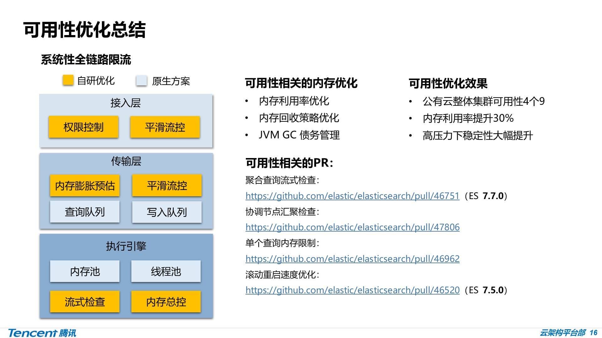 可用性优化效果,我们将公有云的 ES 集群整体可用性提升至 4 个 9,内存利用率提升 30%,高压力场景稳定性有大幅提升,基本能保证节点不会 OOM,集群不会雪崩。