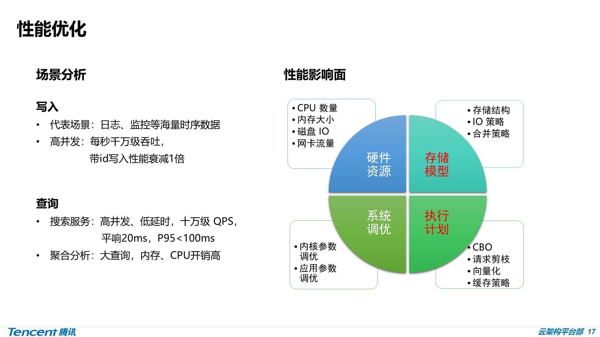 我们看下性能的影响面,左半部分硬件资源和系统调优一般是用户可以直接掌控的,比如资源不够扩容,参数深度调优等。右半部分存储模型和执行计划涉及到内核优化,用户一般不容易直接调整。接下来我们重点介绍一下这两部分的优化。