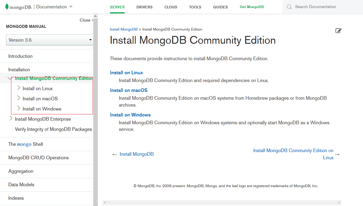 MongoDB的安装比较简单,这里主要给出官方的下载地址,以及官方安装文档的地址,方便大家直达。