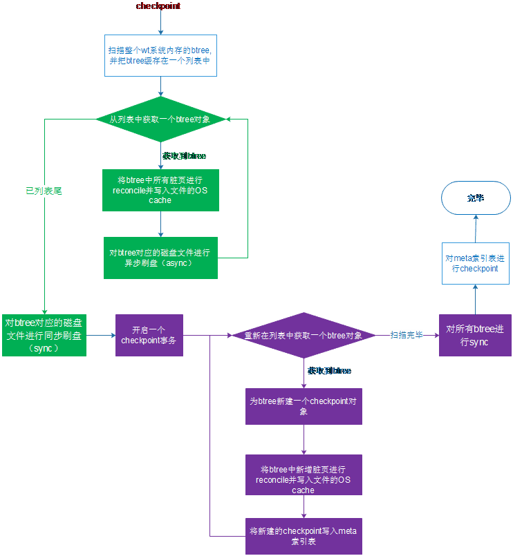 在上图的紫色是真正开始checkpoint事务的步骤,这里需要解释的是由于前面绿色步骤刷盘时间会比较长,在这个时间范围里会有新的写事务发生,也就意味着会新的脏页,checkpint必须把最新提交的事务修改落盘而且还要防止btree的分裂,这个时候就会获得btree的独占排他式访问,这时 eviction cache不能对这个btree上的页进行evict操作(在这种情况下是不是容易造成WT cache满而挂起读写事务?)。